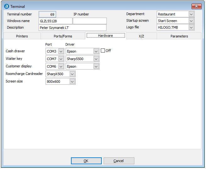 Here the customer display can be defined. Possible displays: Epson, IBM.